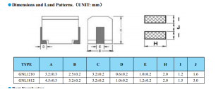 GNL1210J221貼片電感的尺寸:長:3.2±0.3mm,寬:2.5±0.2mm,高:3.2±0.2mm,焊盤寬:0.6±0.2mm,焊盤長:2.0mm。如下圖: